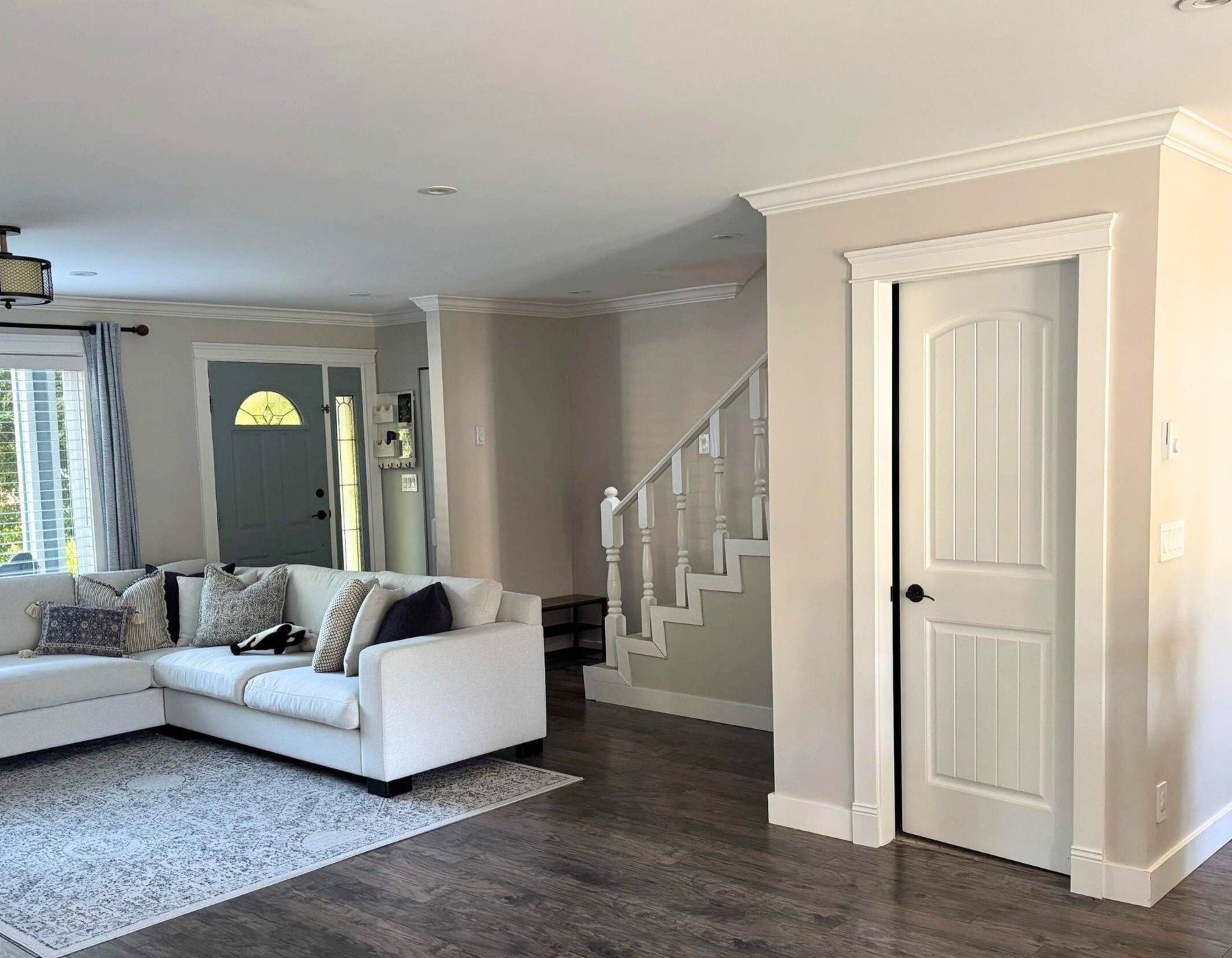 Lighter neutrals like soft whites, warm beiges, and gentle greys help maximize the limited natural light available during Vancouver’s prolonged rainy periods. These colours reflect available light more effectively than darker shades, preventing rooms from feeling cave-like during winter months.